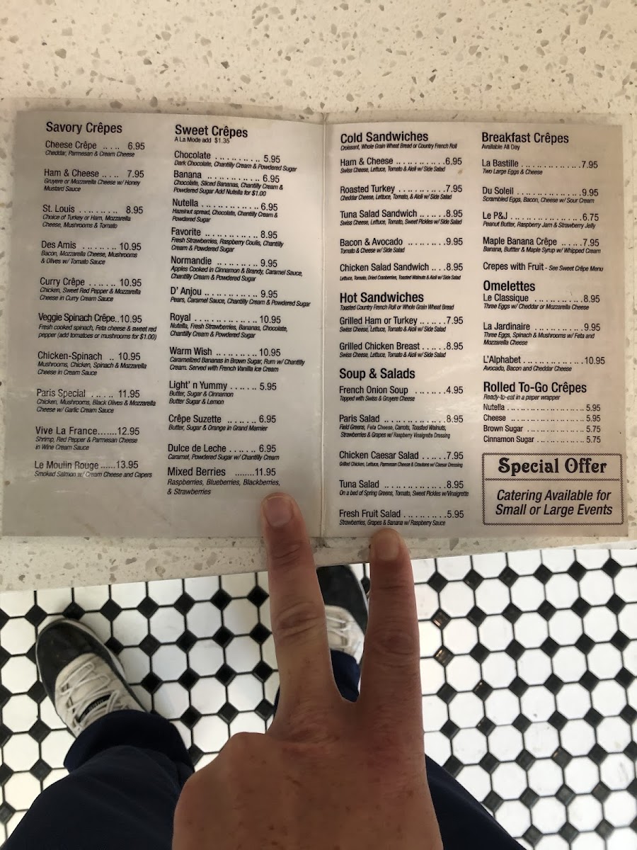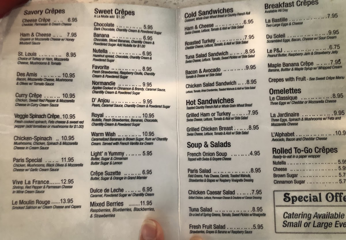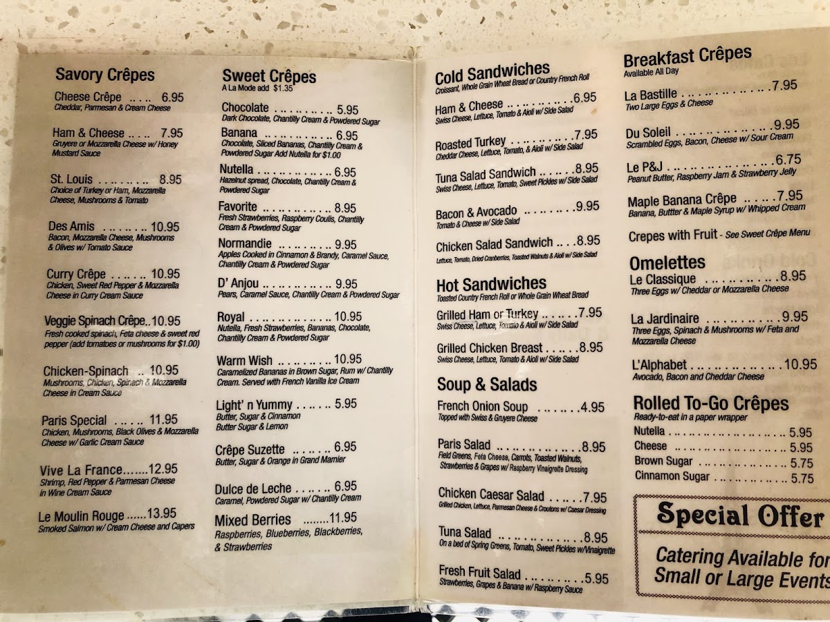 Delicious little restaurant. I enjoyed both a savory crepe, the St. Louis crepe, and a sweet crepe. Parking is available in the building's garage. It cost me 8 for the hour I was there. They charge in 15 minute increments.